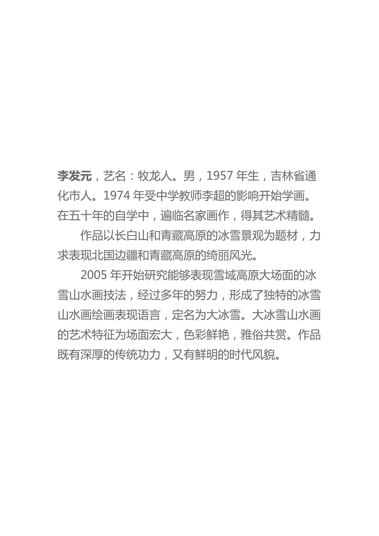 李发元,艺名:牧龙人。男,1957年生,吉林省通化市人。1974年受中学教师李超的影响开始学画。在五十年的自学中,遍临名家画作,得其艺术精髓。